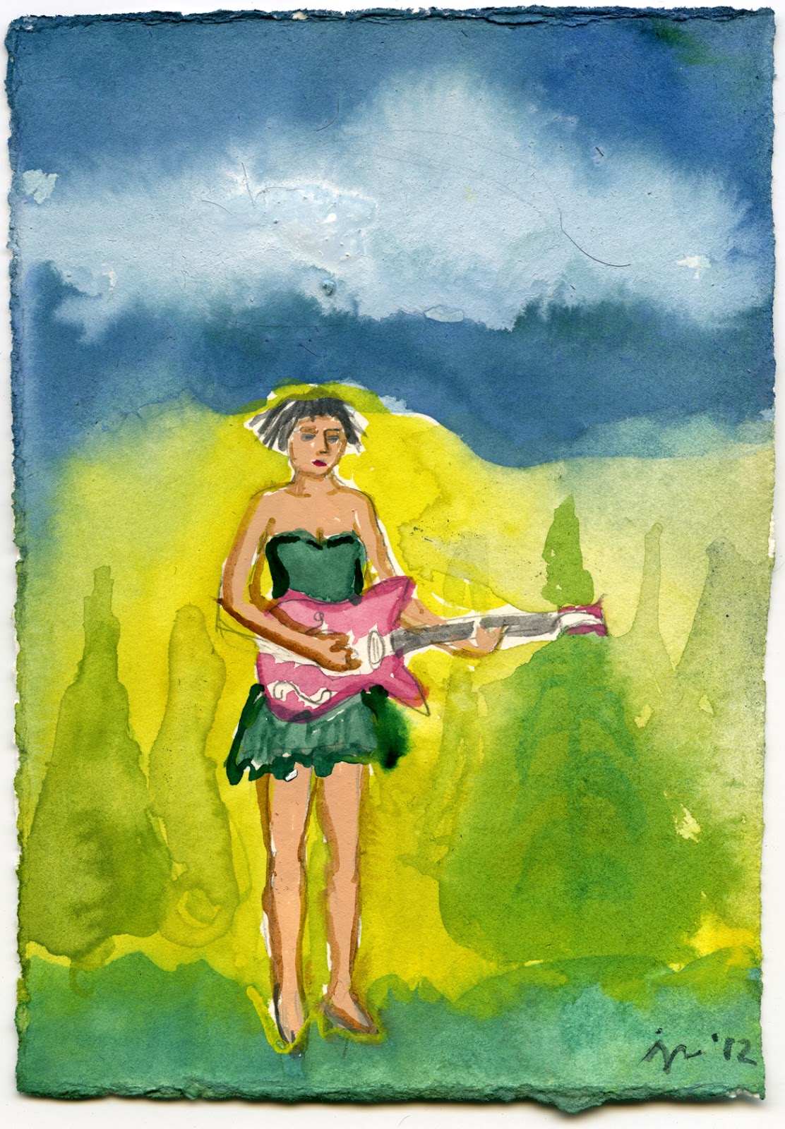 a clumsy little gouache of julie with her jagstang. she's creating a stringy, furry aura.